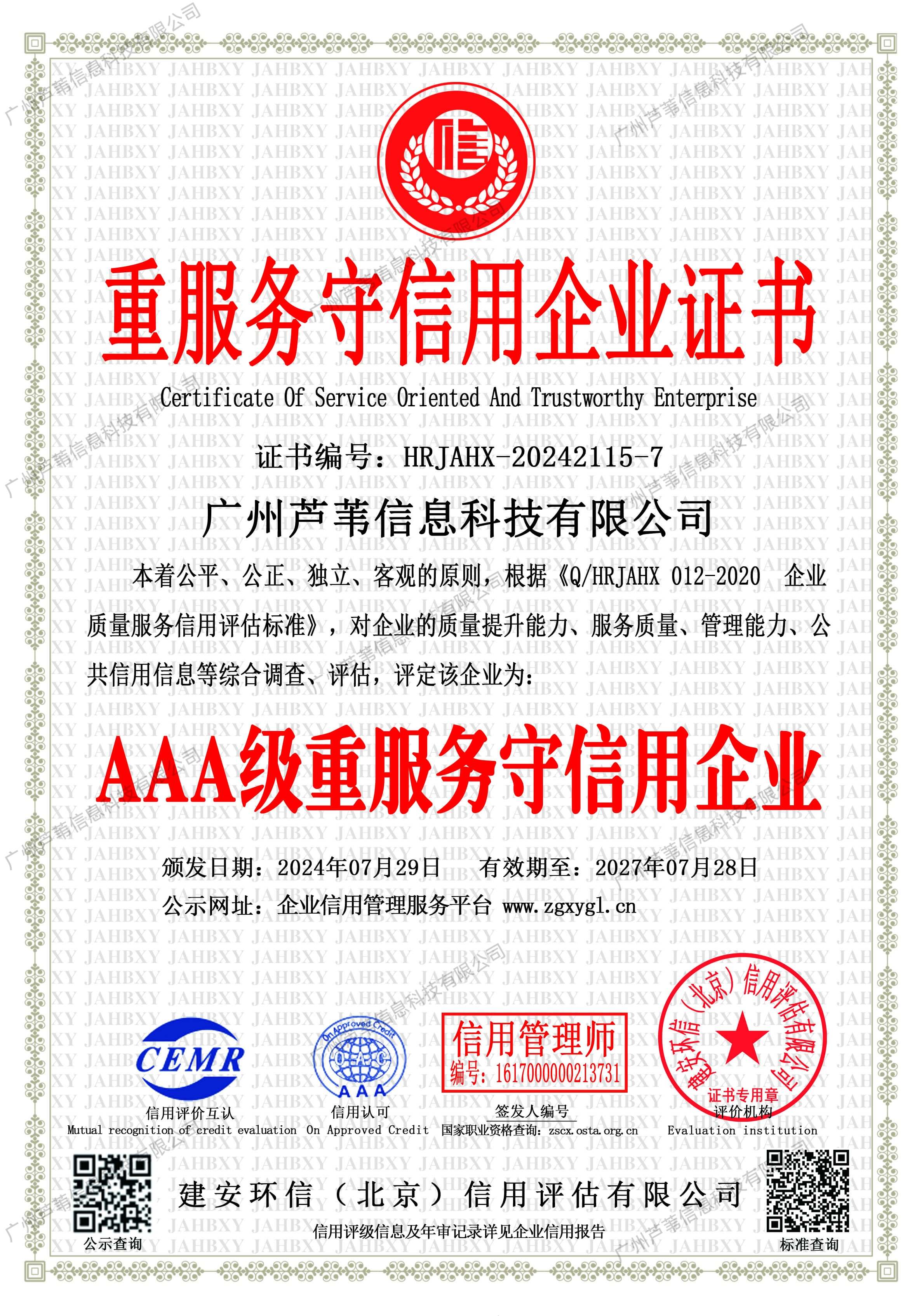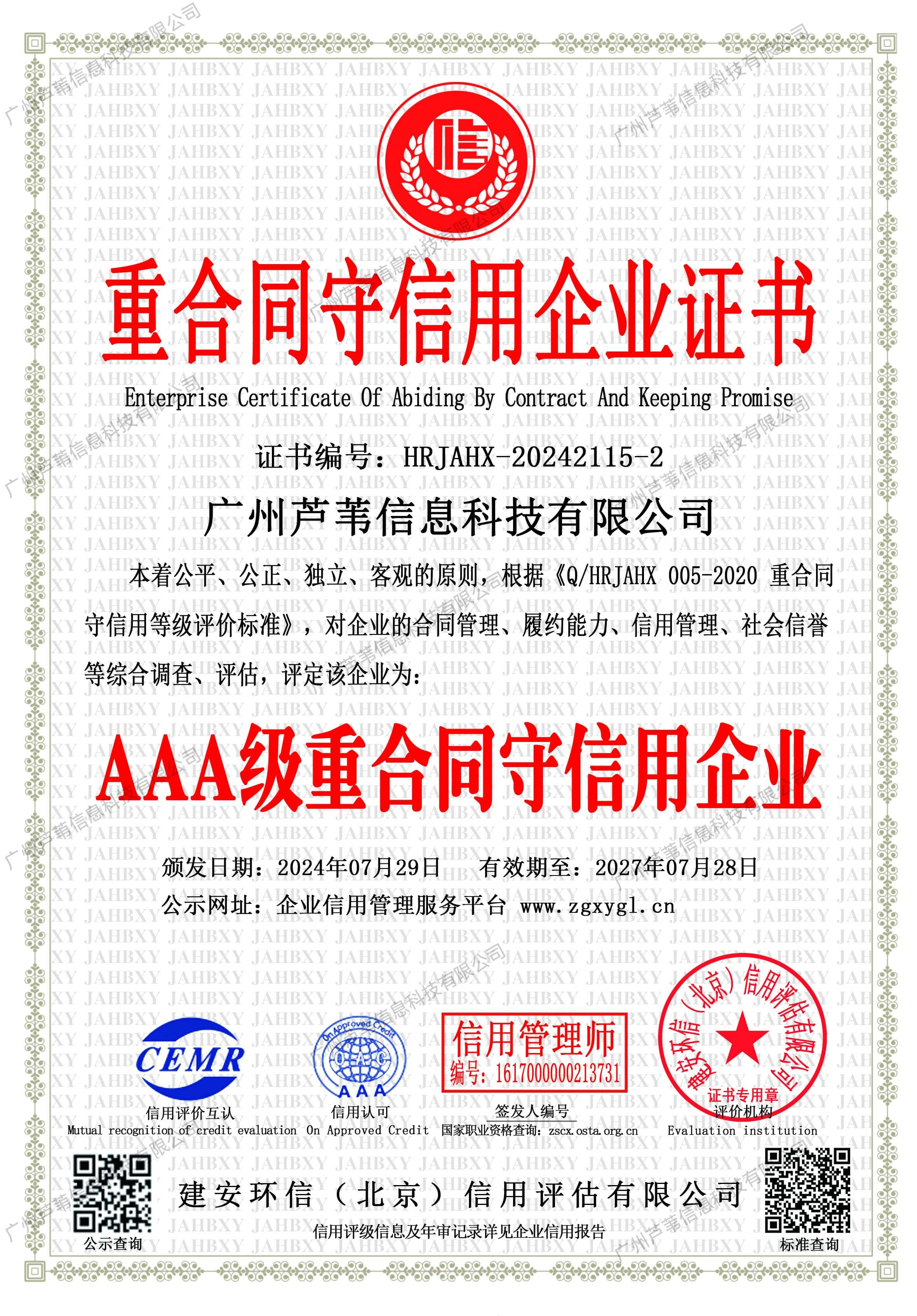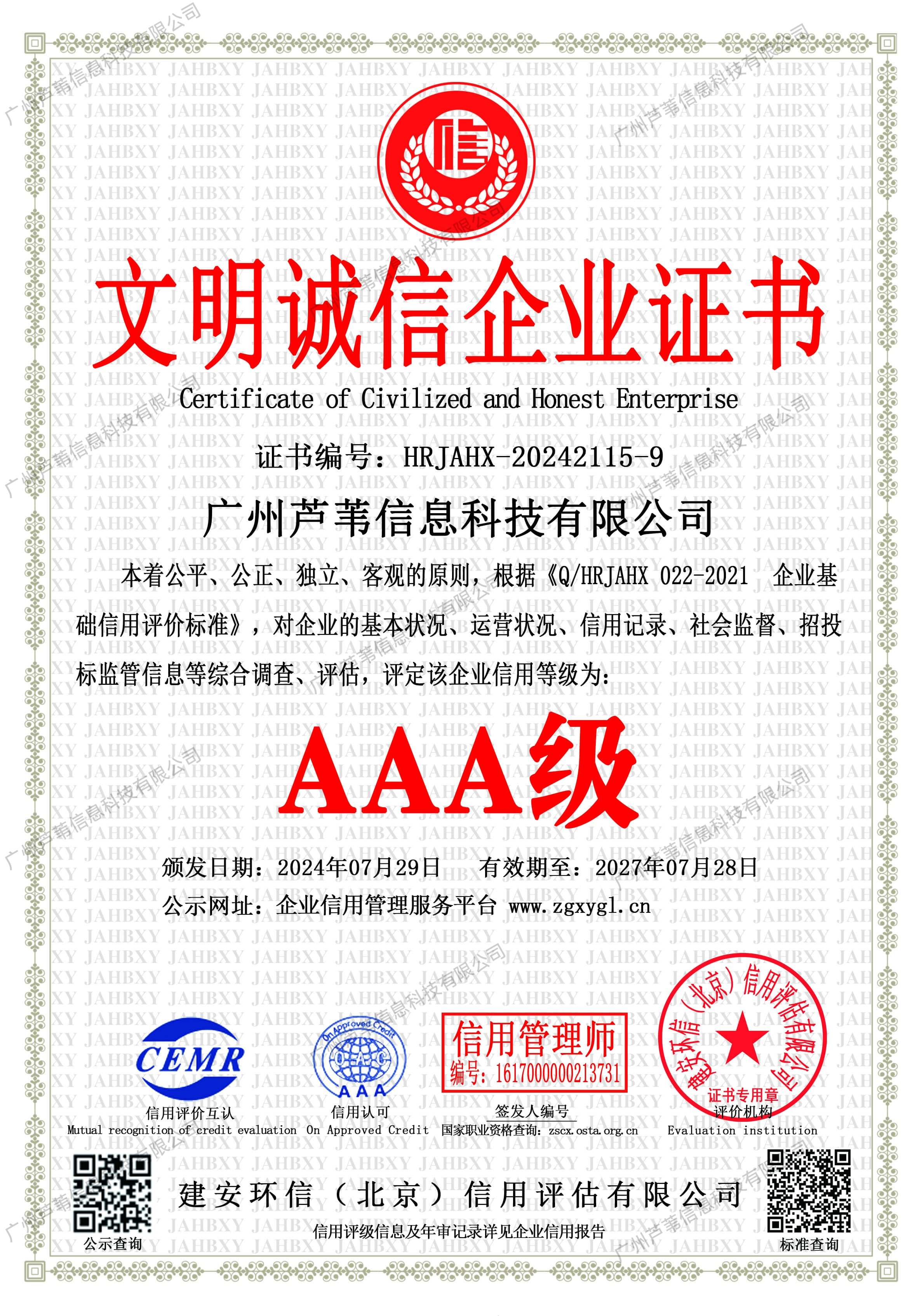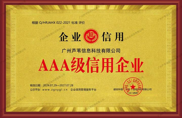AAA级信用企业证书