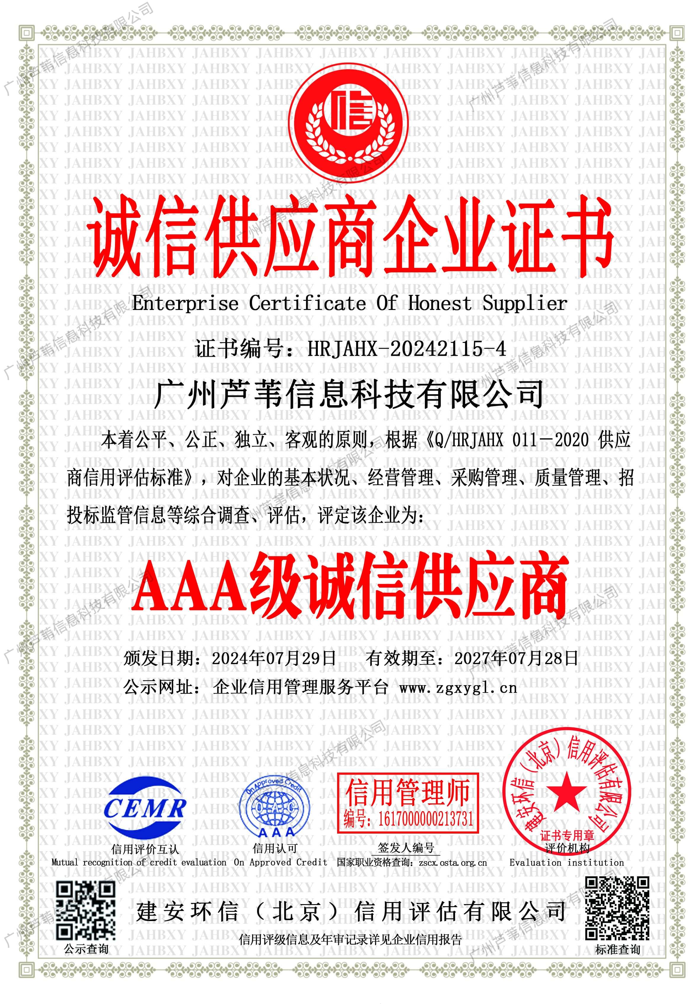 诚信供应商企业证书
